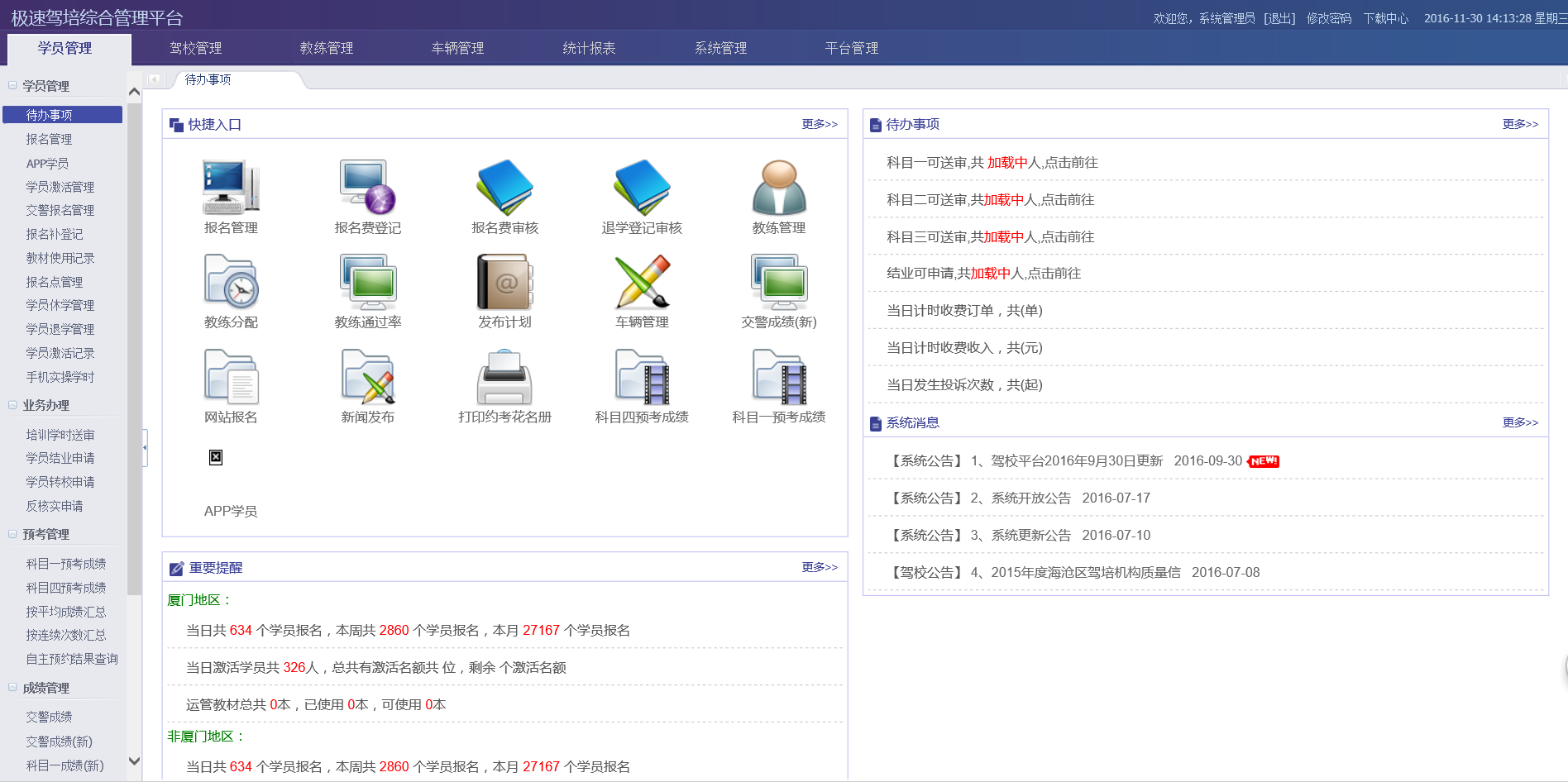 描    述:極速駕培綜合管理(lǐ)平台,由福州中振網絡科(kē)技(jì)有(yǒu)限公司研發,用(yòng)于學時(♦shí)管理(lǐ),駕校(xiào)管理(lǐ)和(hé)交警報(bào)名管理(lǐ)為(wèi)一(yī)體(tǐ)←的(de)綜合管理(lǐ)平台。