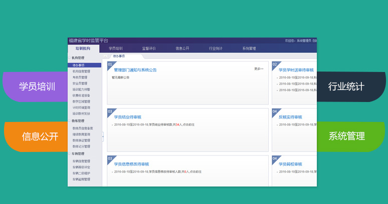 為(wèi)管理(lǐ)部門(mén)提供創造了(le)有(yǒu)效的(de)監管平台,按交通(tōng)部2016新規範,實現(xiàn)培訓機(jī)構,在訓學員(yuán),培訓學時(shí),教練和(hé)車(chē)輛(liàng)的(de)監管功能(néng)